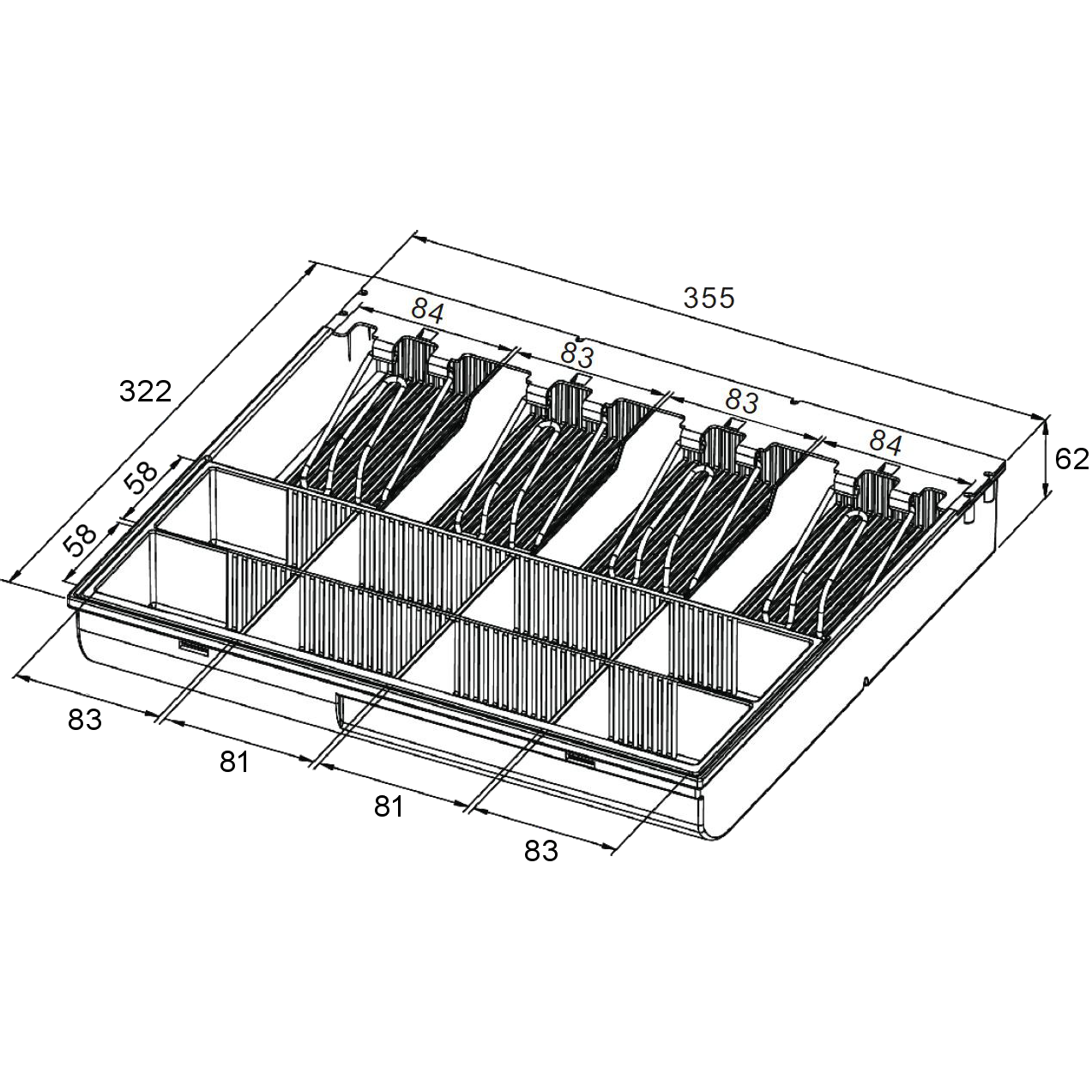 Rozměry: 355 (Š) × 62 (V) × 322 (H) mm